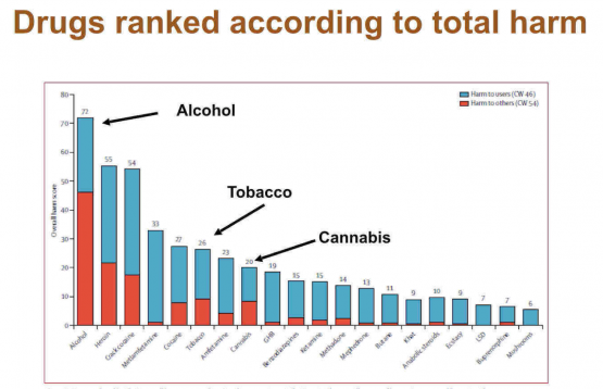 He points to the following graph by Psych Scene Hub on how cannabis is ranked as the least harmful form of drug in comparison to alcohol and tobacco.
