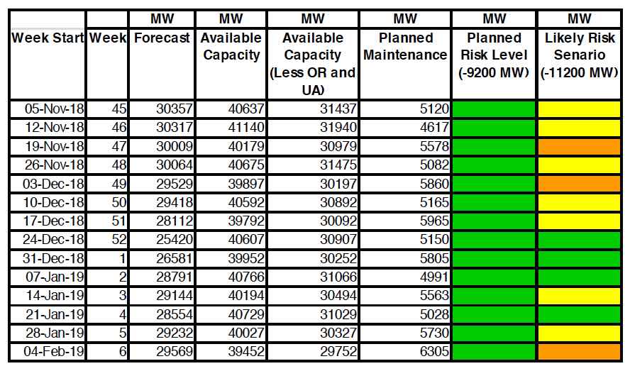 Eskom’s three-month forecast of weekly demand versus available generating capacity. The coloured blocks indicate the absence or presence of a capacity constraint: green (adequate generation; no shortage), yellow (possibility of not being able to meet reserves), and orange (definitively too short to meet reserves and, possibly, demand). Note that OR refers to ‘operating reserve’ and UA to ‘unplanned outage assumption’. Source: Eskom Weekly System Status Report, Week 44, 2018